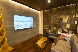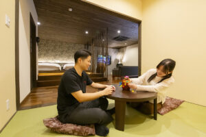 全面ひの木貼りの心地よい香りが漂う露天風呂、広いバルコニーに設置された足湯。開放感のあるリビングにはマッサージチェアを設置。非日常の中にある、ゆとりのある広さと、和の空間。それは、何にも縛られずに心を解放する贅沢な時間。心の落ち着く場所をお楽しみください。
